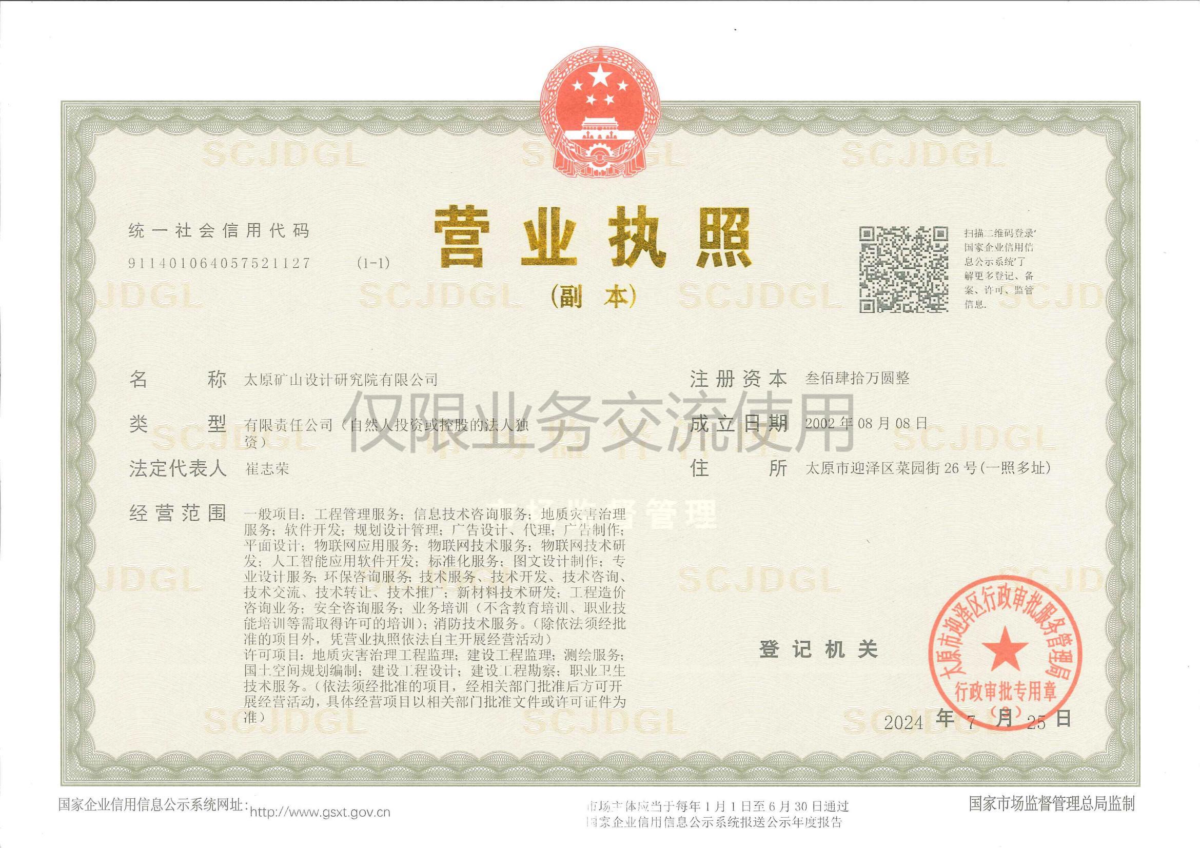 公司主要從事礦山采選尾工程設(shè)計(jì)、智能化及自動(dòng)化礦山、建設(shè)綠色礦山、工程技術(shù)咨詢、規(guī)劃設(shè)計(jì)管理、施工勞務(wù)分包、土地規(guī)劃、地質(zhì)災(zāi)害治理服務(wù)、安全生產(chǎn)技術(shù)服務(wù)、軟件開(kāi)發(fā)及測(cè)繪服務(wù);煤礦、非煤礦山設(shè)計(jì);煤礦、非煤礦山、危險(xiǎn)化學(xué)品安全評(píng)價(jià)(業(yè)務(wù)范圍:煤炭開(kāi)采業(yè);金屬、非金屬及其他礦采選業(yè);石油加工業(yè),化學(xué)原料、化學(xué)品及醫(yī)藥制造業(yè));非煤礦山、冶金等工商貿(mào)企業(yè)、危險(xiǎn)化學(xué)品從業(yè)單位安全生產(chǎn)標(biāo)準(zhǔn)化評(píng)審;公共場(chǎng)所衛(wèi)生、生活飲用水、公共場(chǎng)所集中中央空調(diào)通風(fēng)系統(tǒng)的檢驗(yàn)、檢測(cè)、評(píng)價(jià);職業(yè)健康檢測(cè)檢驗(yàn);建設(shè)項(xiàng)目職業(yè)病危害評(píng)價(jià)、職業(yè)危害因素檢測(cè)與評(píng)價(jià);安責(zé)險(xiǎn)技術(shù)服務(wù);業(yè)務(wù)培訓(xùn)等工作。